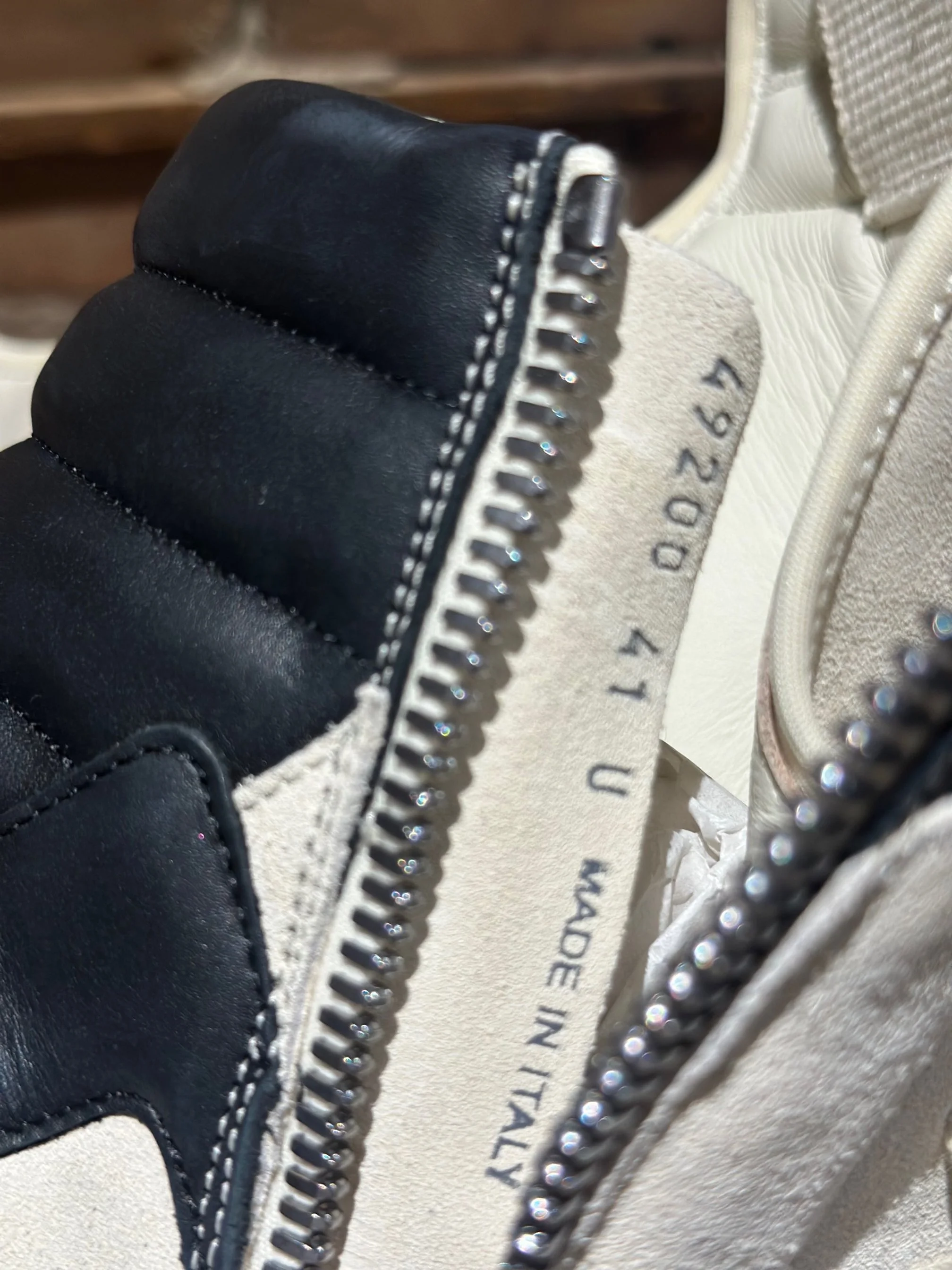 These high-top sneakers feature a luxe blend of cream suede and black calf leather, delivering bold contrasts and architectural edge. With an exaggerated padded tongue, shark-tooth sole, and full-length side zipper, the Geobasket embodies Owens' avant-garde streetwear aesthetic while offering elevated craftsmanship made in Italy.