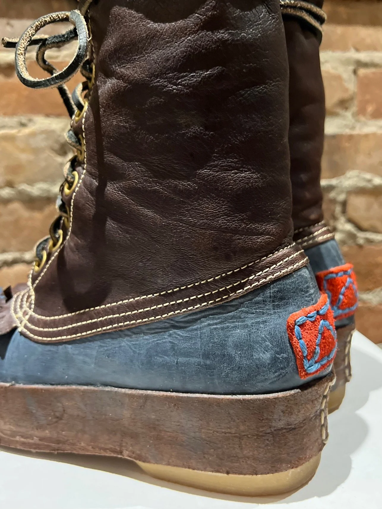 This is a rare and collectible pair of Visvim Decoy Duck Boot Alu-Folk in a Blue/Brown colorway, released as part of Visvim’s Free International Laboratory line. These boots feature a hand-stitched indigo blue rubber duck toe, chestnut brown leather shaft, and contrast cream stitching throughout. Red and blue woven Visvim heel tabs add subtle archival branding.
